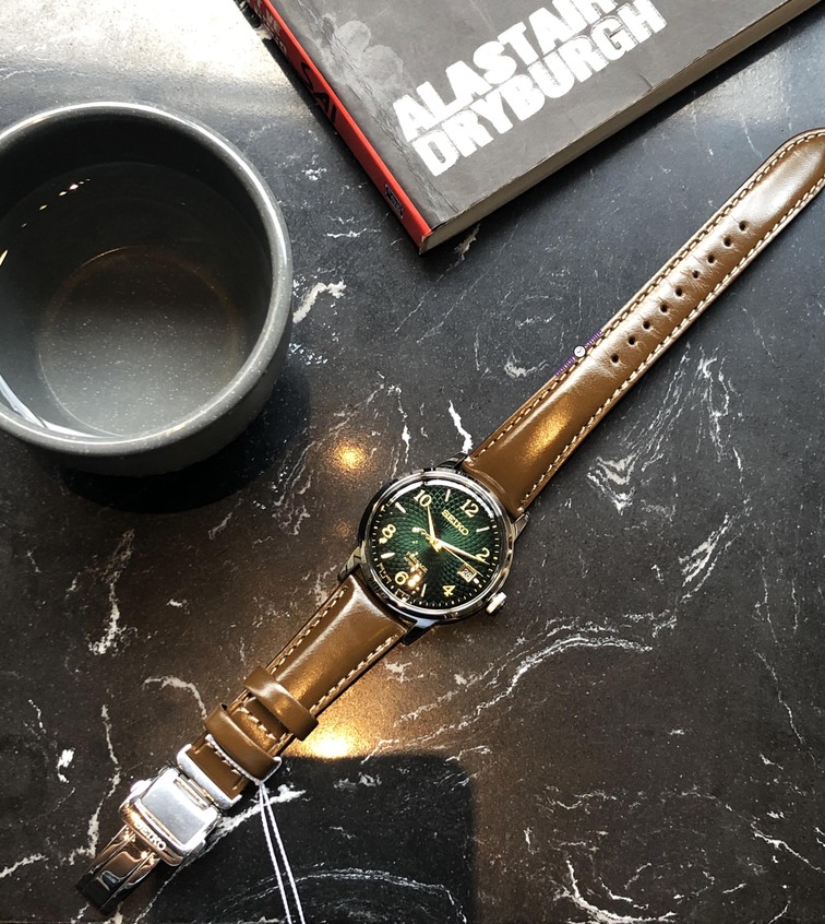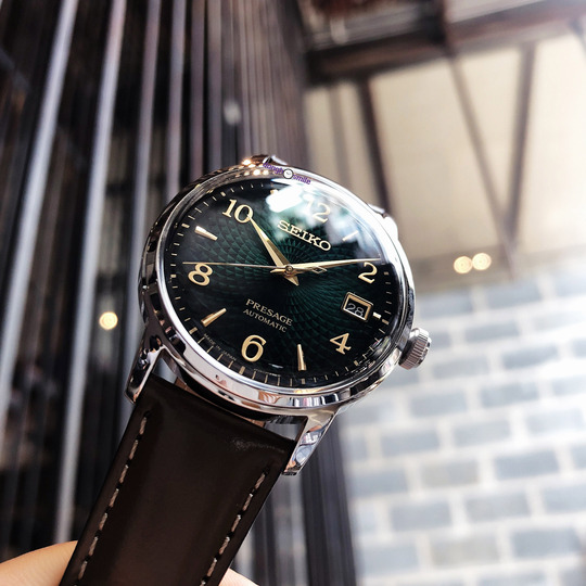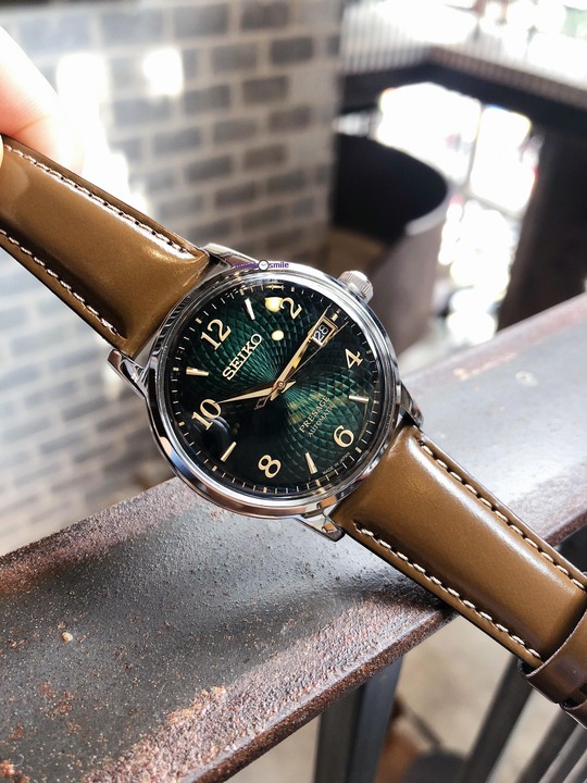 Nổi bật với Dial xanh lá tươi sáng được chải vân gợn sóng vòng cầu trùng phùng đan xen lên nhau