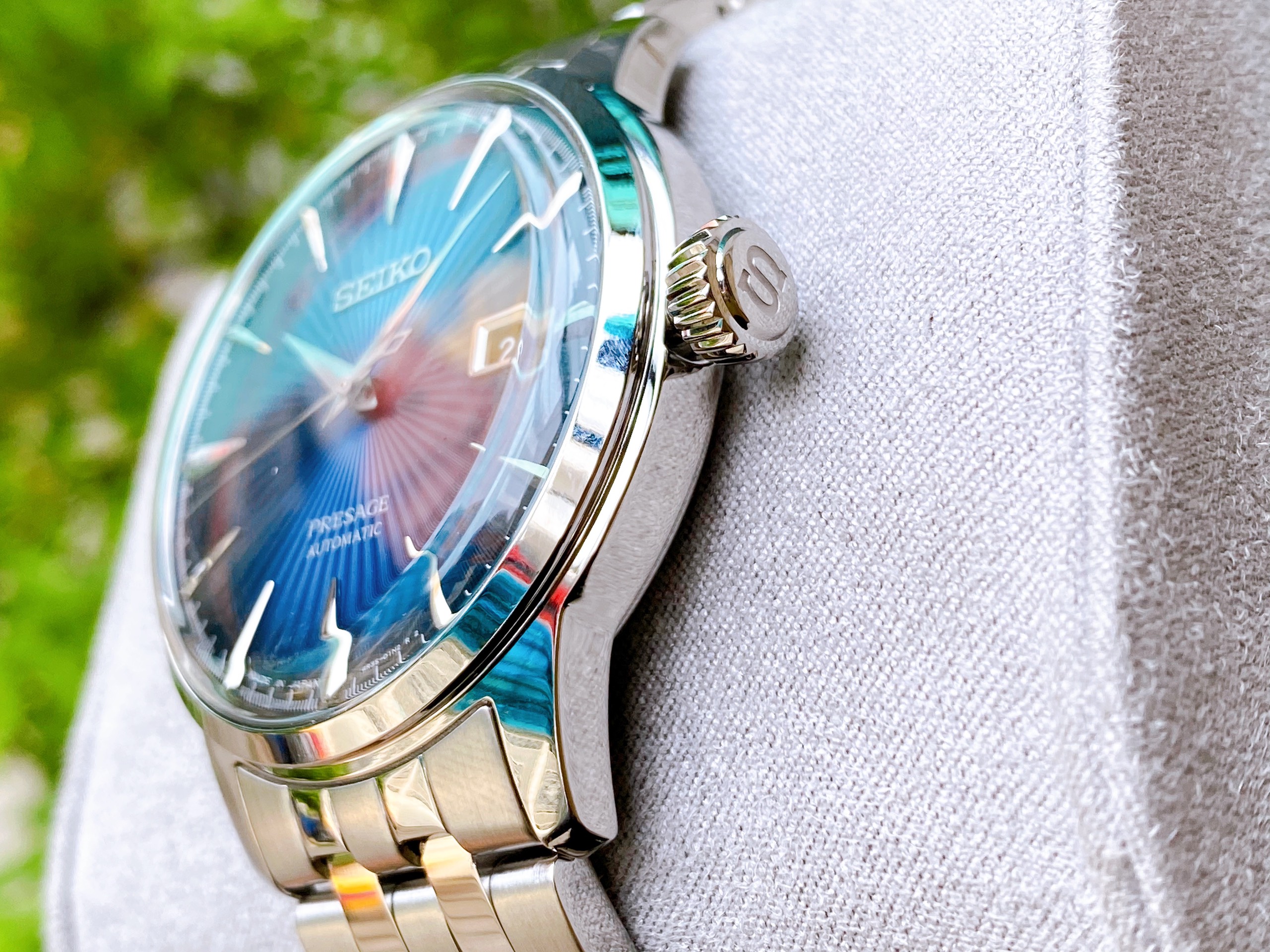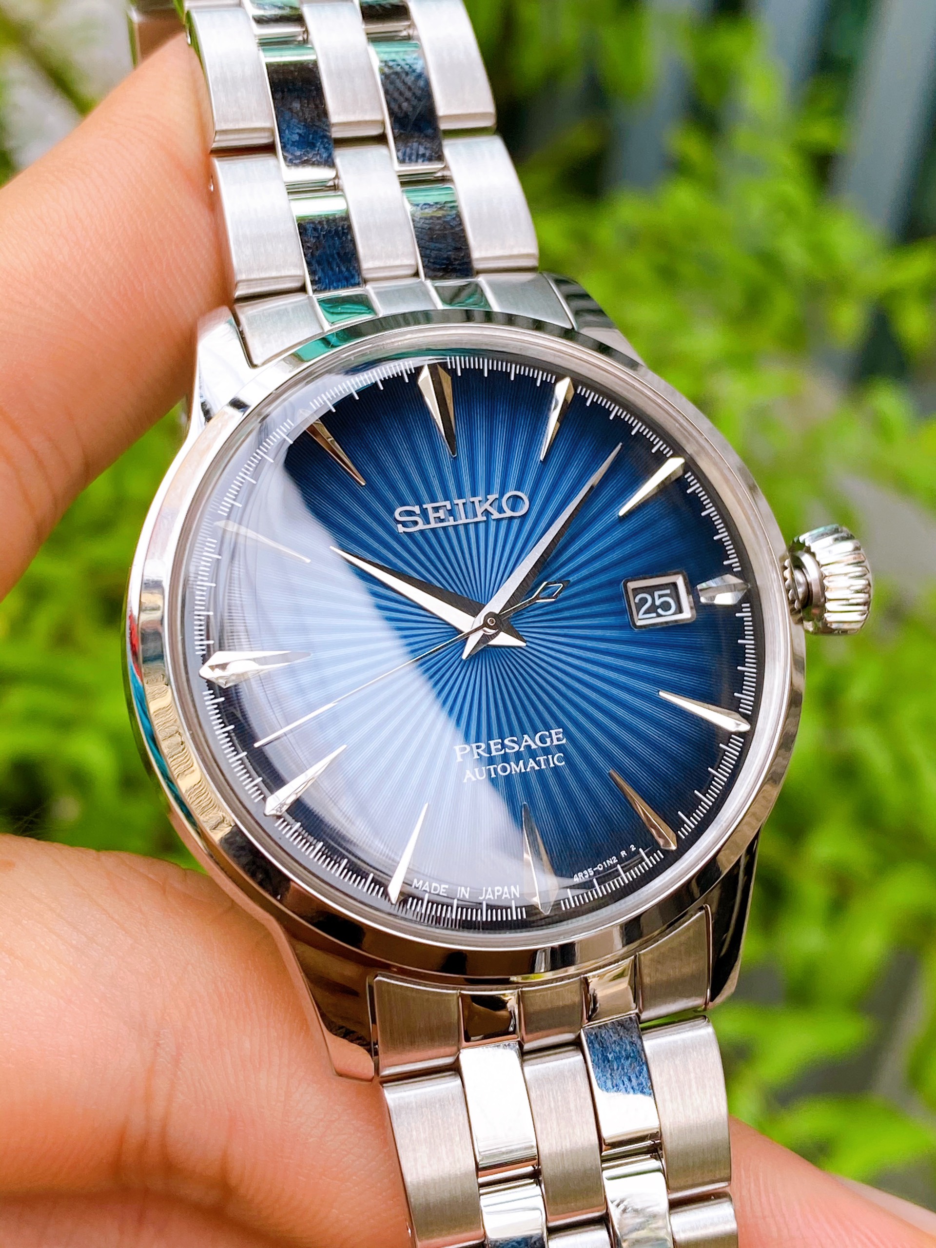 Thuộc bộ sưu tập Cocktail và luôn trong tình trạng cháy hàng. Model này đánh gục ngay từ cái nhìn đầu tiên bởi màu xanh Dial cực bắt mắt. Màu xanh này càng được làm nổi bật hơn bởi thấu kính cong của model. Kim và cọc số được thiết kế tinh tế, trau chuốt, mang đậm nét Seiko.