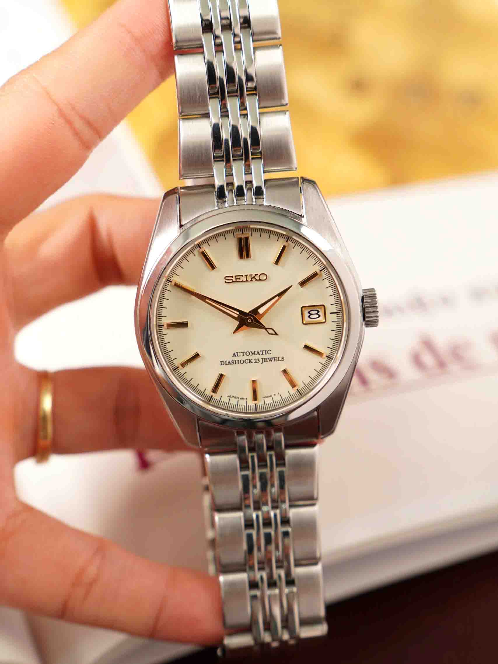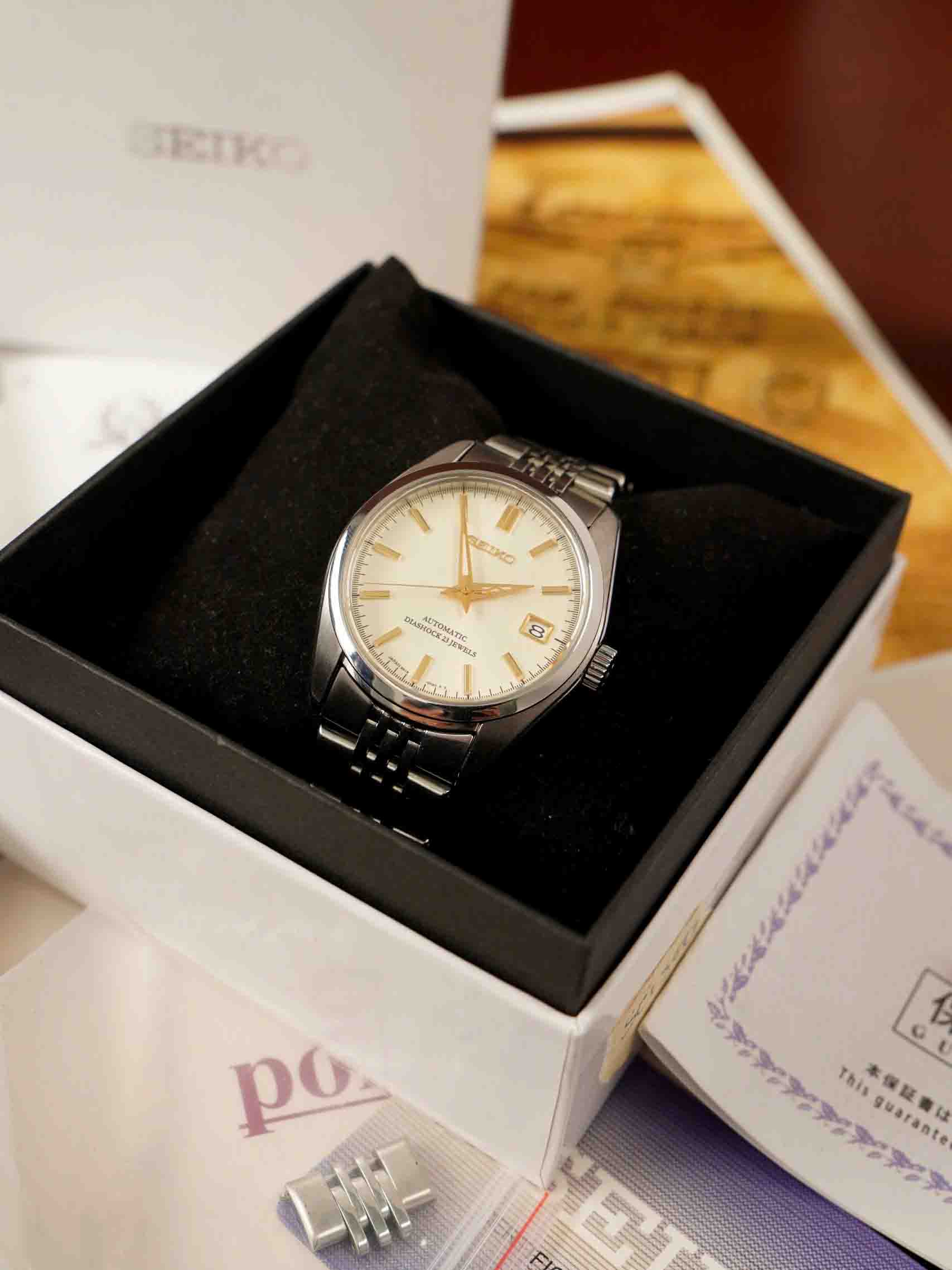 Một chiếc Seiko đã ngừng sản xuất thuộc bộ sưu tập Spirit , quá hiếm hoi ở thời điểm hiện tại . Với nhiều yếu tố quen mắt của đồng hồ cổ bên cạnh bộ máy Tân 6R15 mạnh mẽ và bền bỉ . Cổ điển nằm ở màu ngà vàng của mặt số , chữ diashock đã lâu lắm rồi mới thấy lại, các chi tiết ở nắp sau được khắc chìm tạo cảm giác trường tồn cùng năm tháng ( khác với hiện tại chỉ là khắc lazer mờ ) , kết hợp với dây thép mắt gạo => hết nước chấm thật sự