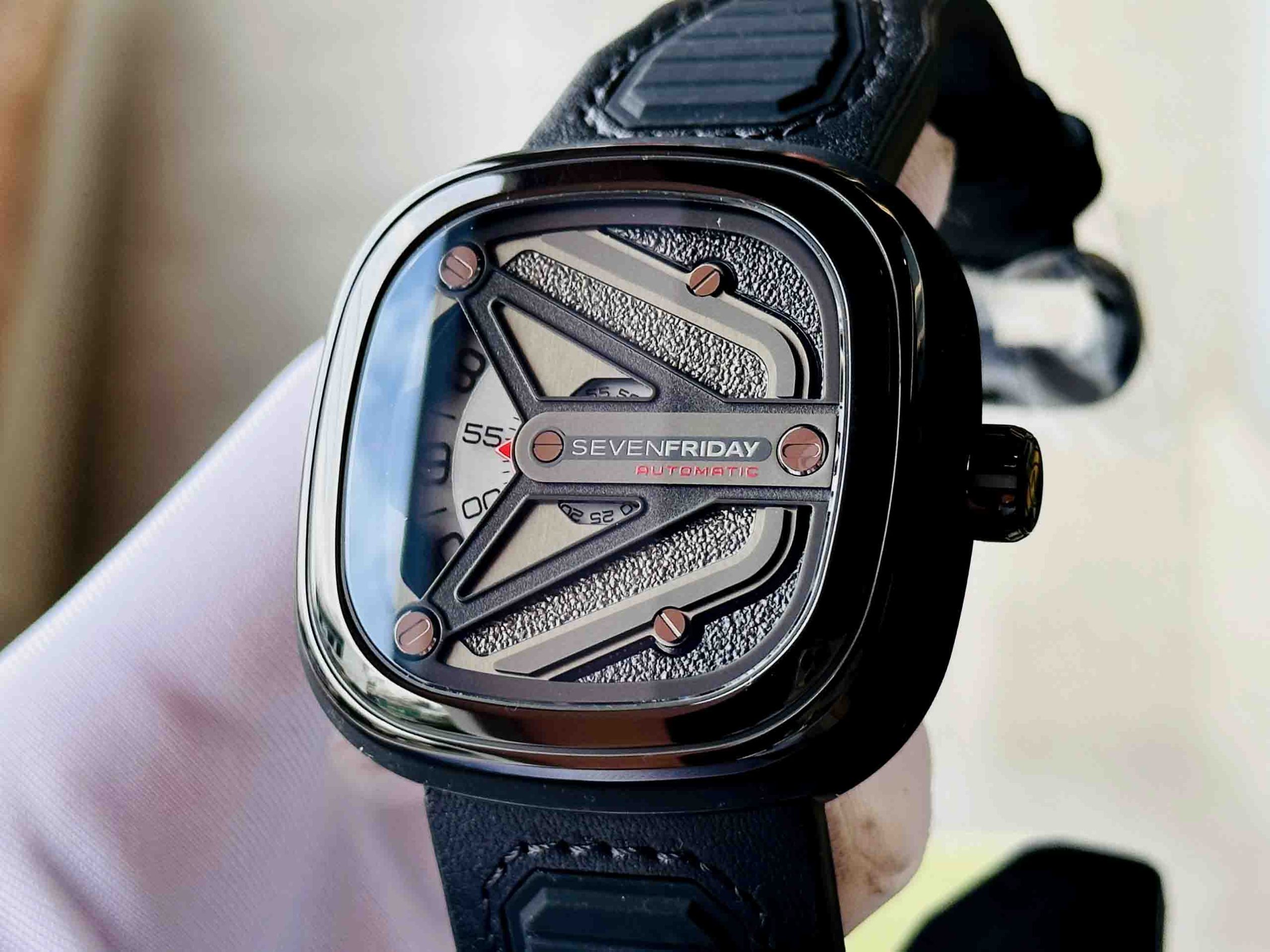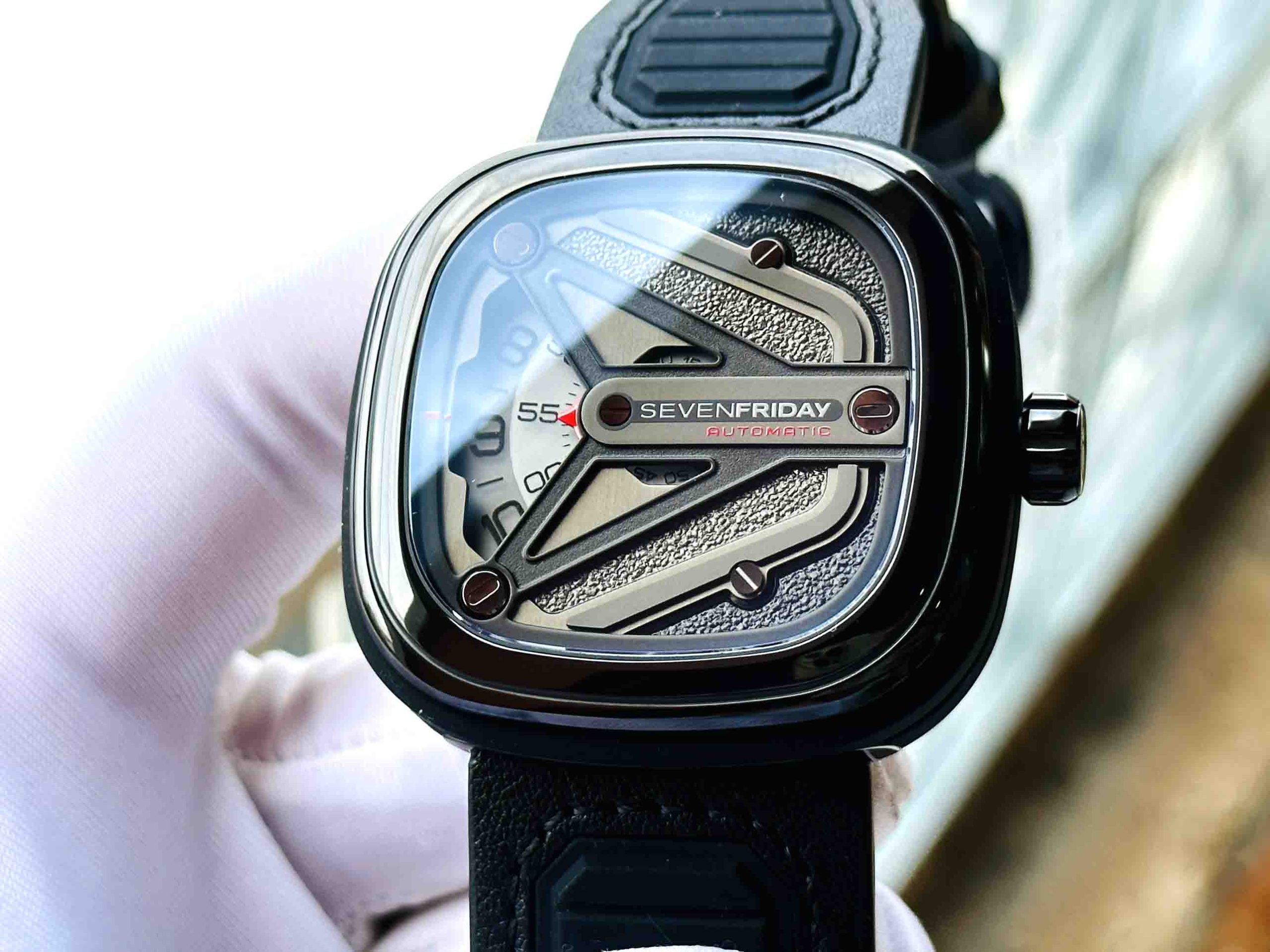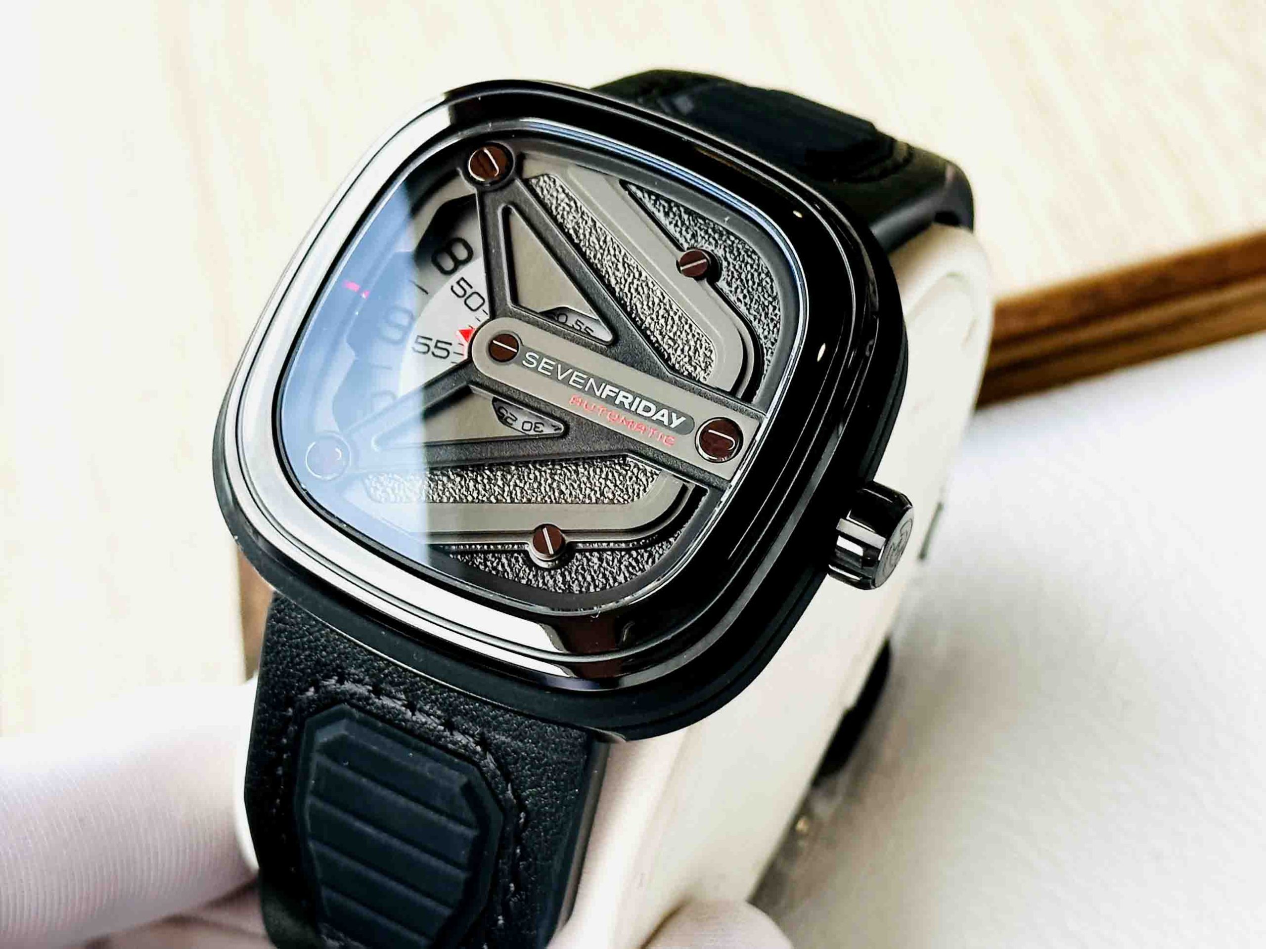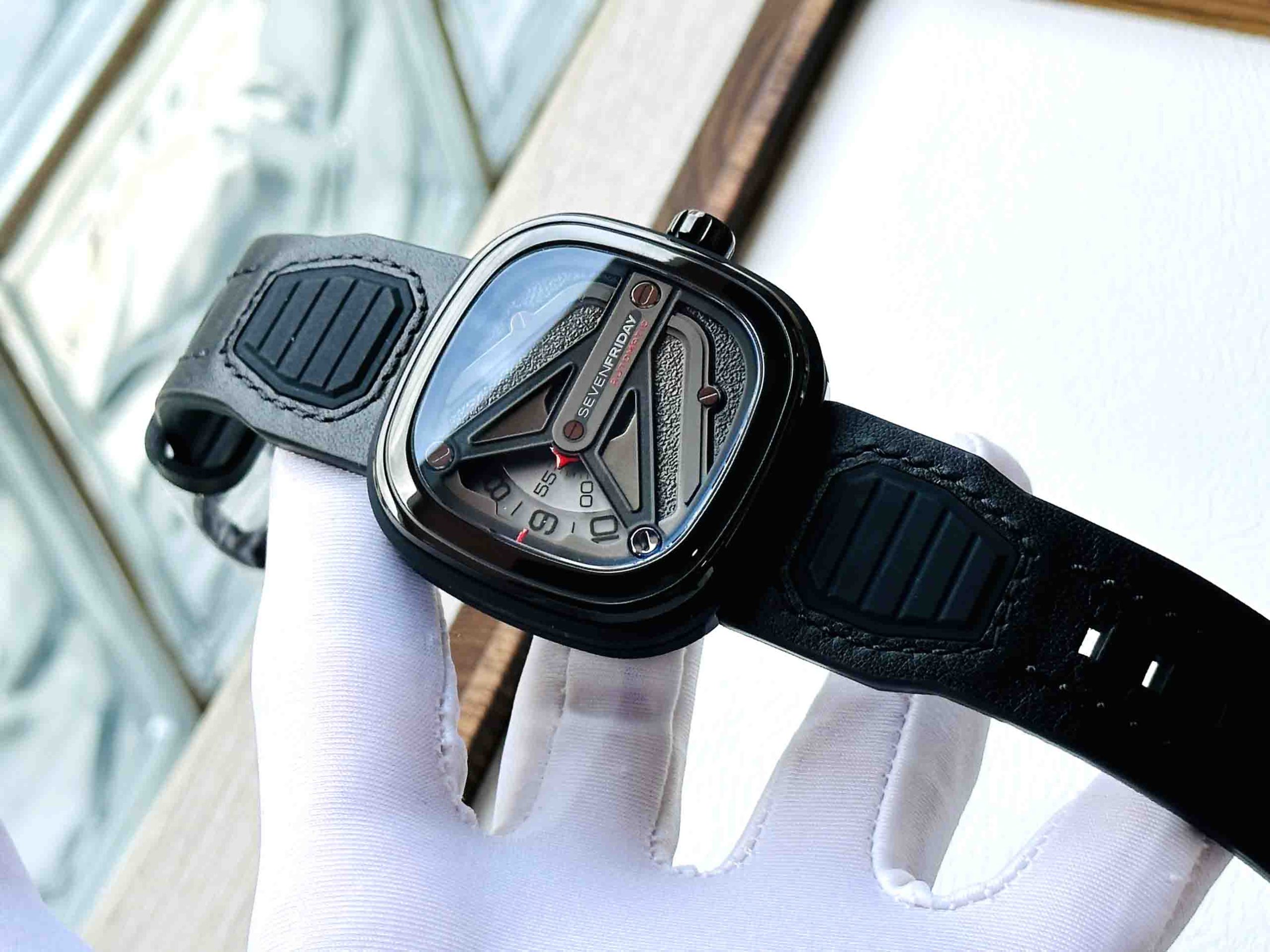 – Mặt đồng hồ: 7 lớp đĩa được hoàn thiện phun cát và đánh bóng màu đen và màu nòng súng nằm bên dưới 1 cánh chữ Y được khắc tên thương hiệu SevenFriday