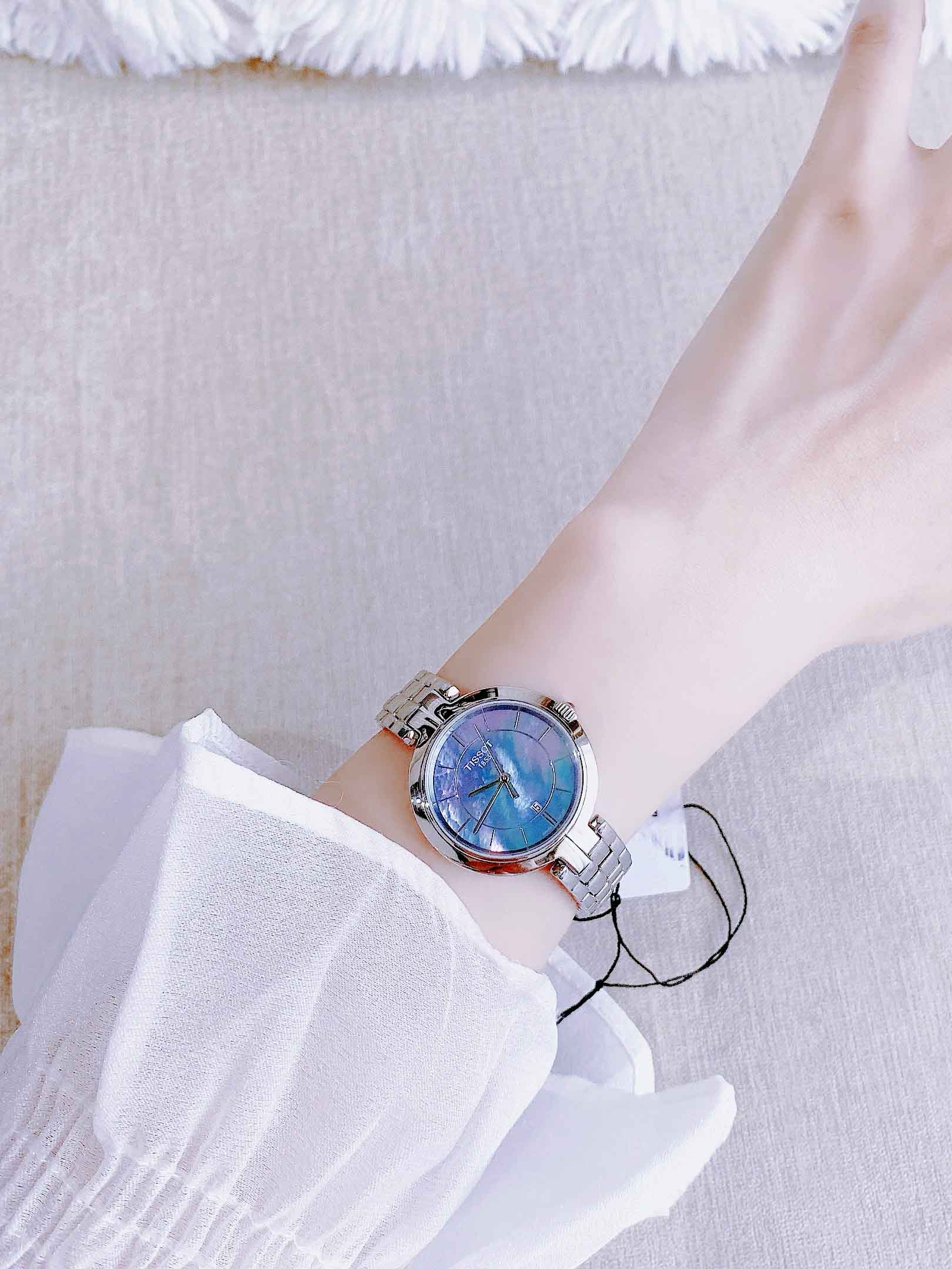 Tissot Flamingo Black Mother of Pearl Dial Stainless Steel Ladies Quartz T094.210.11.121.00 (T0942101112100) có mặt số màu xanh nhạt là màu của bầu trời, … thể hiện một trạng thái ổn định, chiều sâu của tâm hồn và nhận thức.