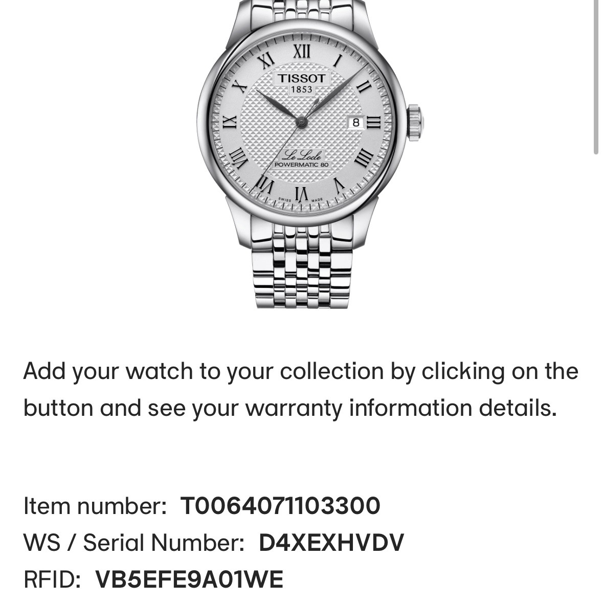 Tissot Le Locle Powermatic 80 White T0064071103300 – Likenew
