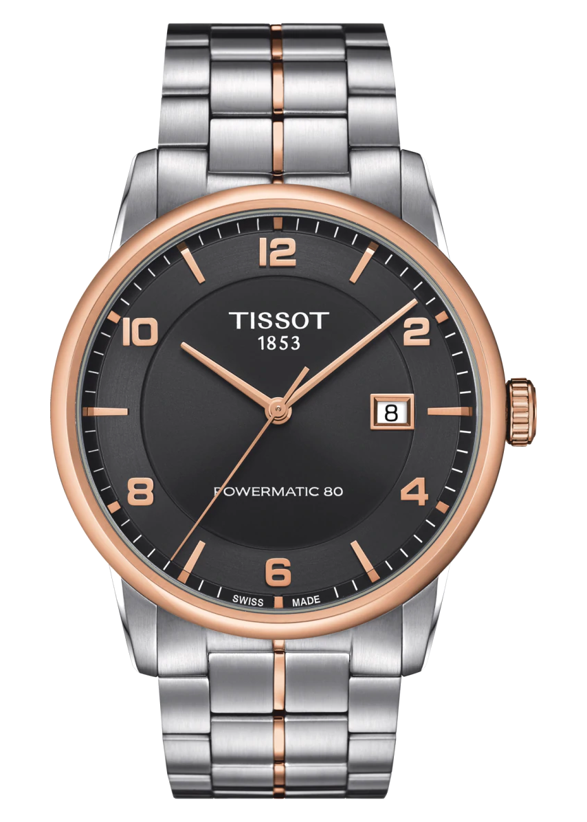 Đồng hồ nam Tissot T-Classic Luxury Powermatic 80 T086.407.22.067.00. Tông màu demi bạc và vàng hồng lên tay sang trọng. Vỏ thép không gỉ với vòng đeo tay bằng thép không gỉ hai tông màu (tông bạc và vàng hồng PVD).