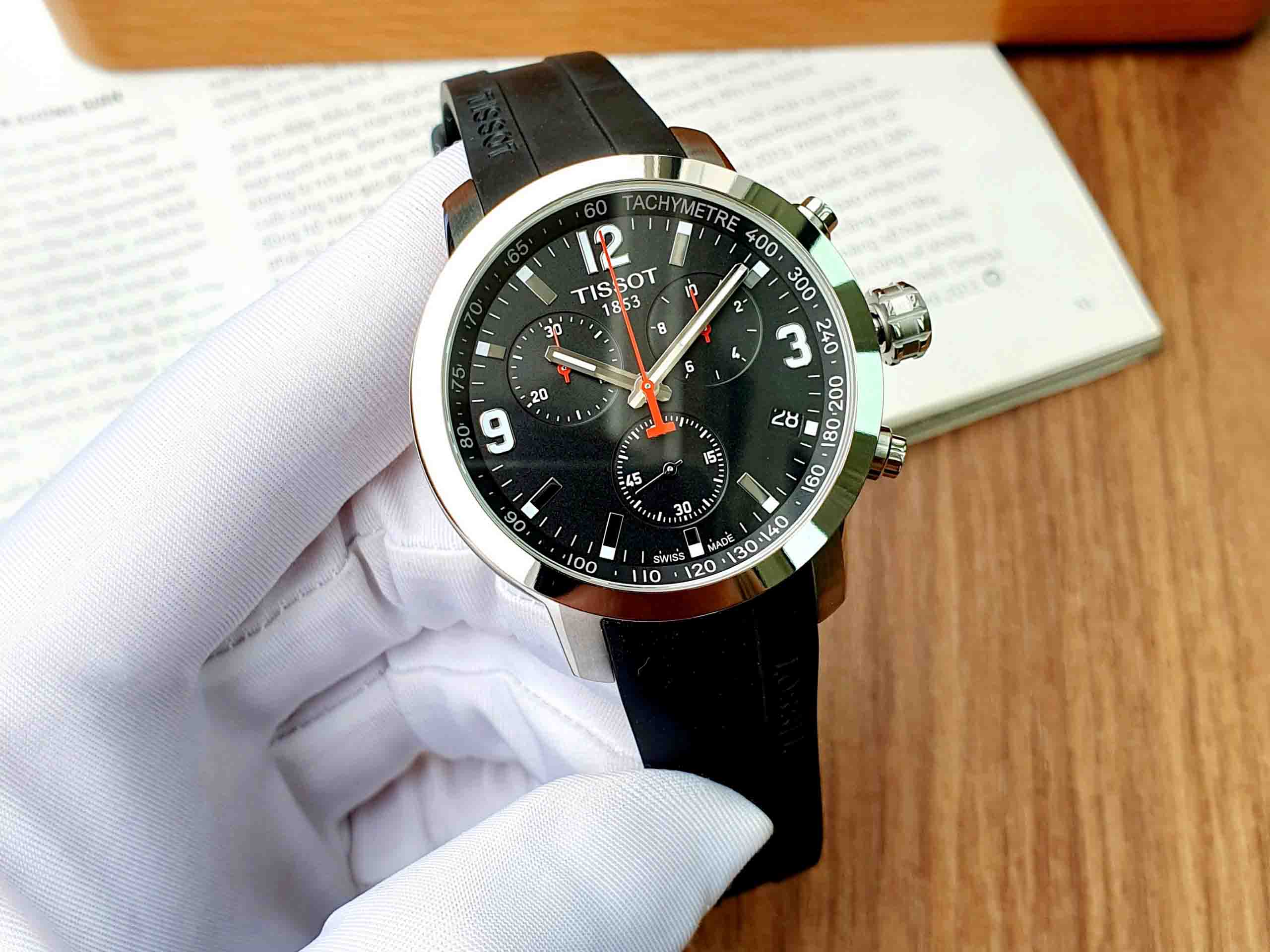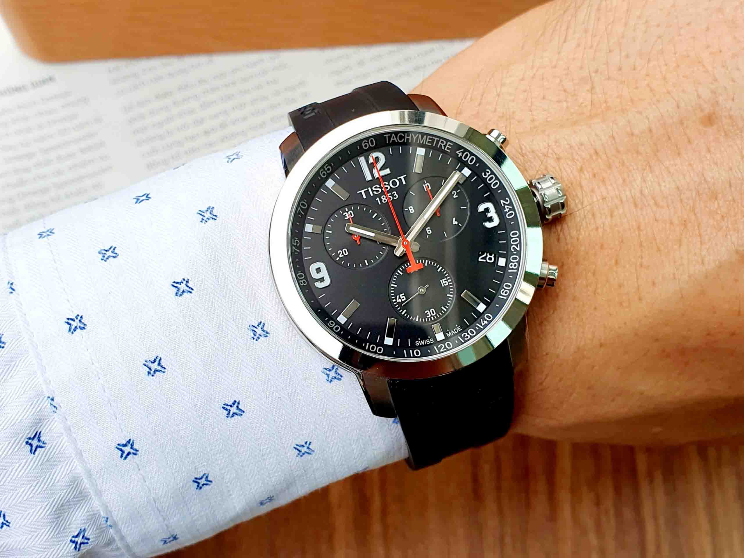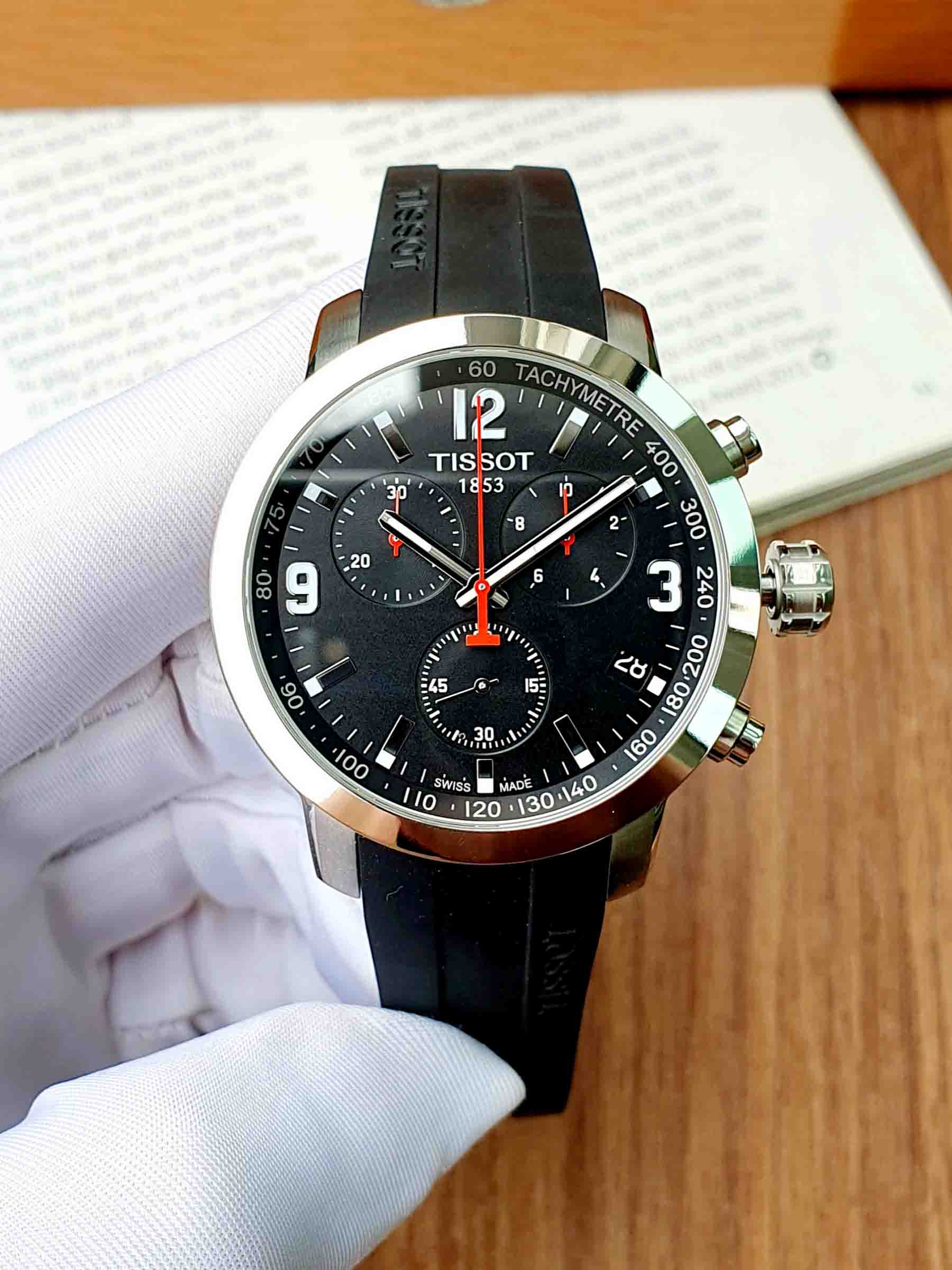 Thiết kế 6 kim độc đáo với 3 sub dial màu đen trên nền đồng hồ, kết hợp nổi bật cùng kim chữ T đặc trưng màu đỏ đẹp mắt
