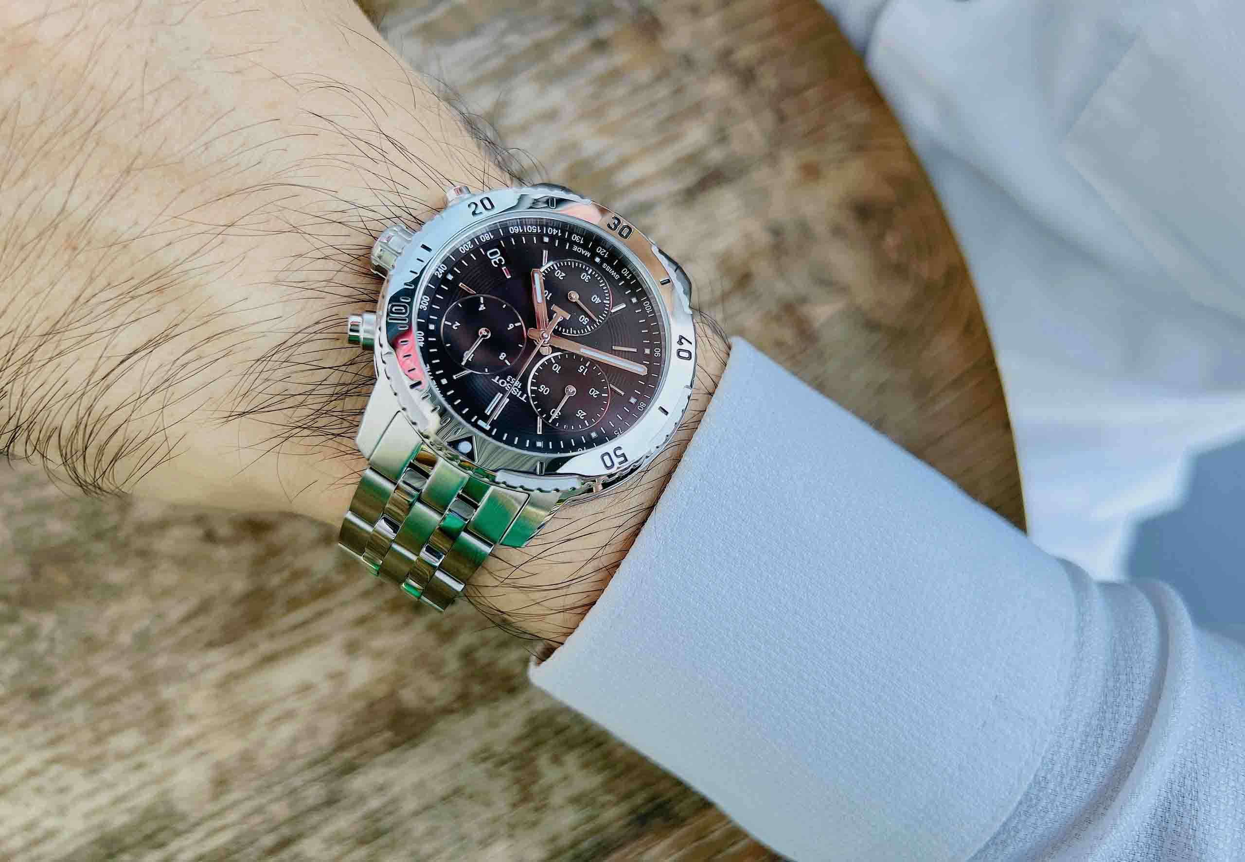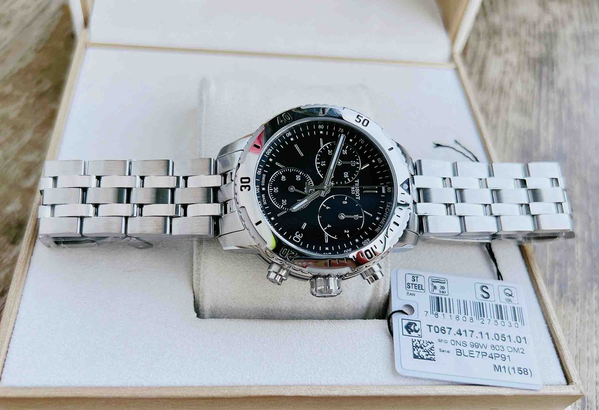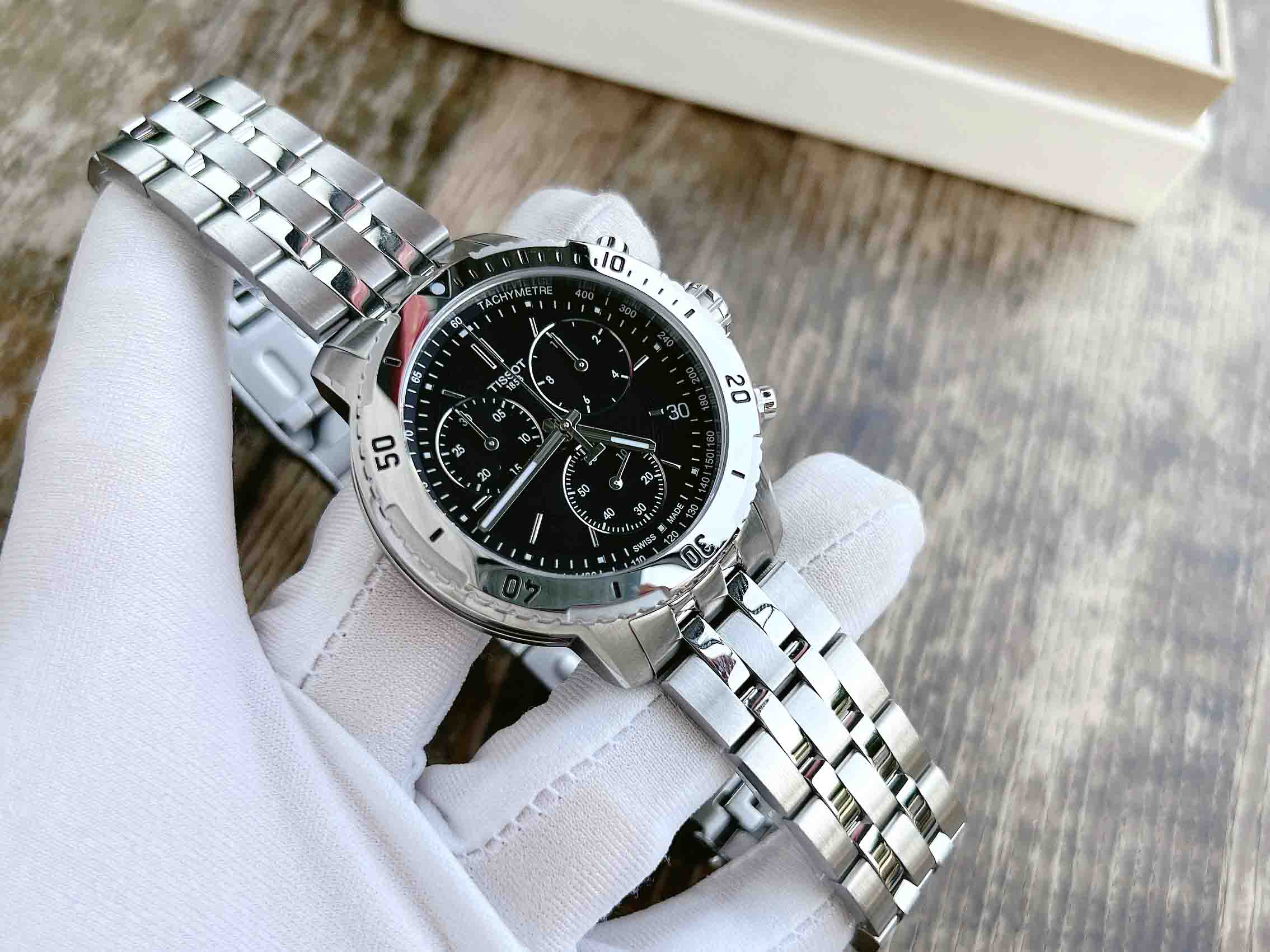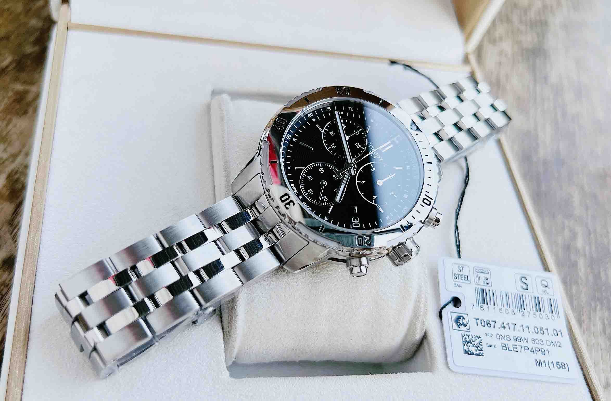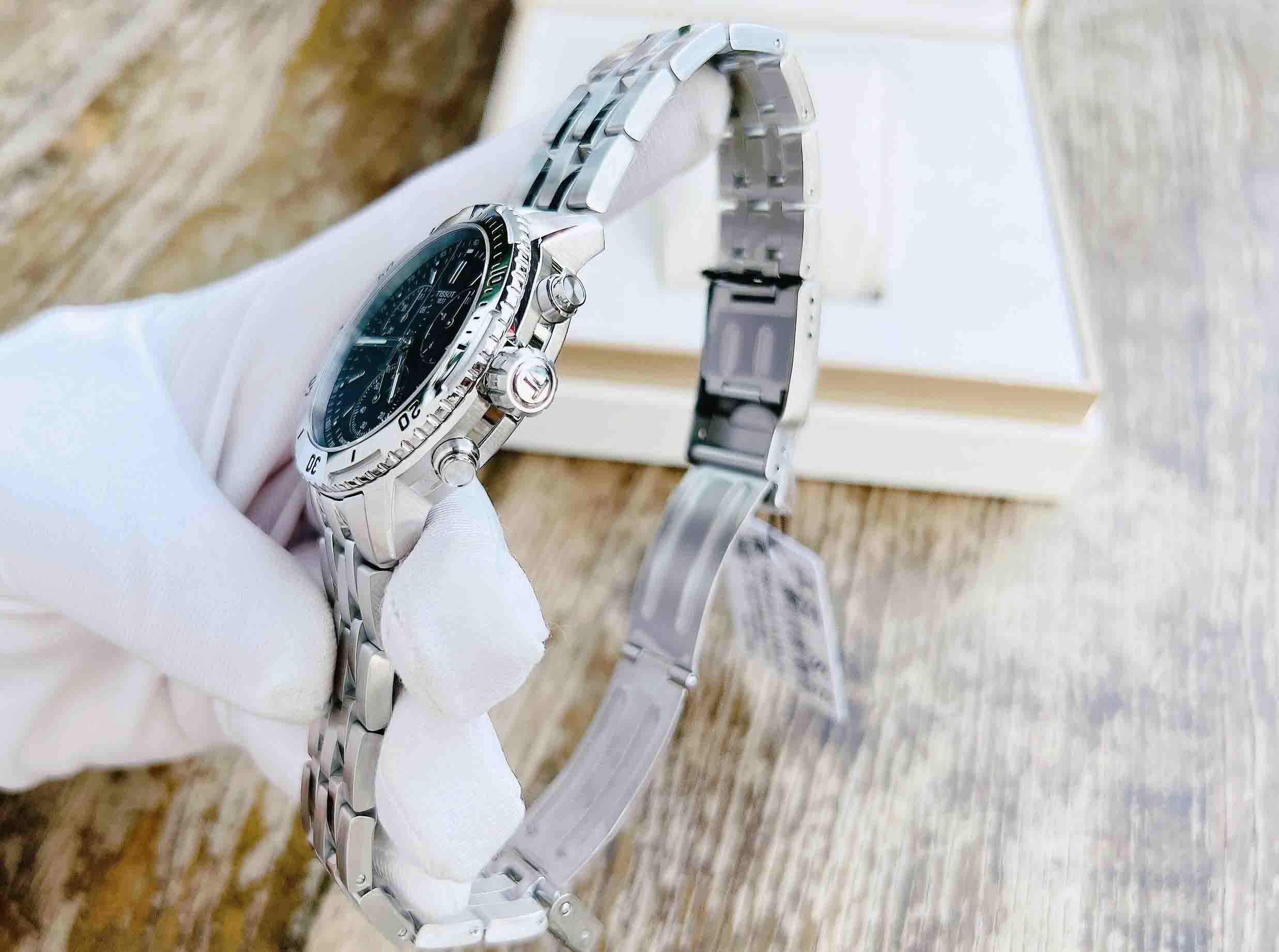 TISSOT PRS 200 (2016) T067.417.11.051.01 (mặt đen, vỏ trắng, dây kim loại trắng)