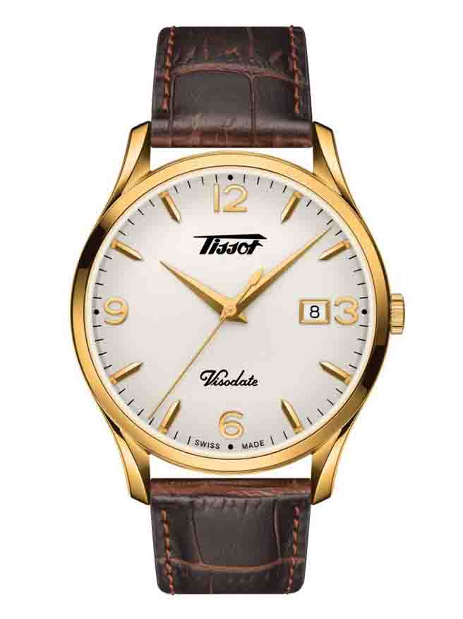 Mẫu Tissot T118.410.36.277.00 phong cách hoài cổ với sự kết hợp bộ dây da nâu tạo hình vân lịch lãm cùng vỏ máy pin mạ vàng, thiết kế đơn giản 3 kim trên mặt số trắng