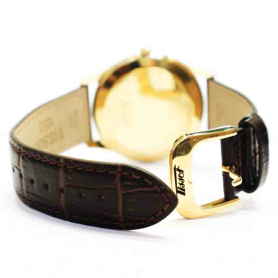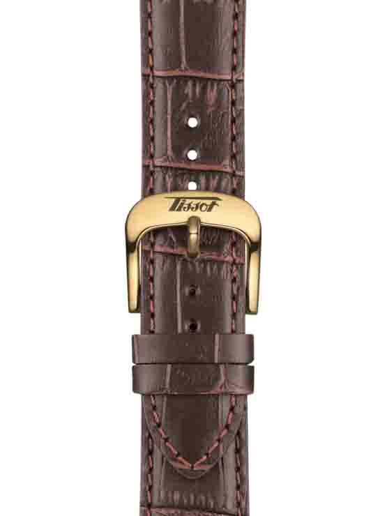 Mẫu Tissot T118.410.36.277.00 phong cách hoài cổ với sự kết hợp bộ dây da nâu tạo hình vân lịch lãm cùng vỏ máy pin mạ vàng, thiết kế đơn giản 3 kim trên mặt số trắng